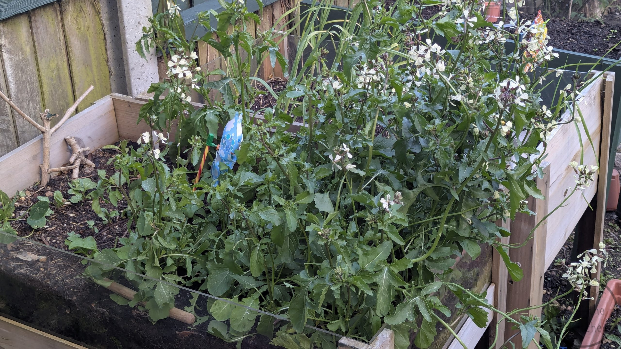 In some bizarre twist of nature, my rocket patch not only overwintered and sprang back to life, but in the warmer spring days and longer light, burst forth into large leaves and flowers this Easter.